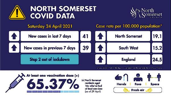 The latest figures published show that up to 29 April 65.37% of North Somerset residents aged 16 and over have had at least one dose of the Covid-19 vaccination.