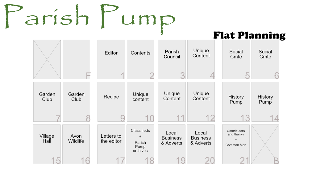 With Parish Council funding for the Parish Pump confirmed, the discussions with the printing company could move on to the details, such as how many pages, what type of paper, hard cover or soft, glossy or matt. Born from this, the current plan is to produce four editions per year, each of around 22 pages, full colour, a glossy magazine full of local content.