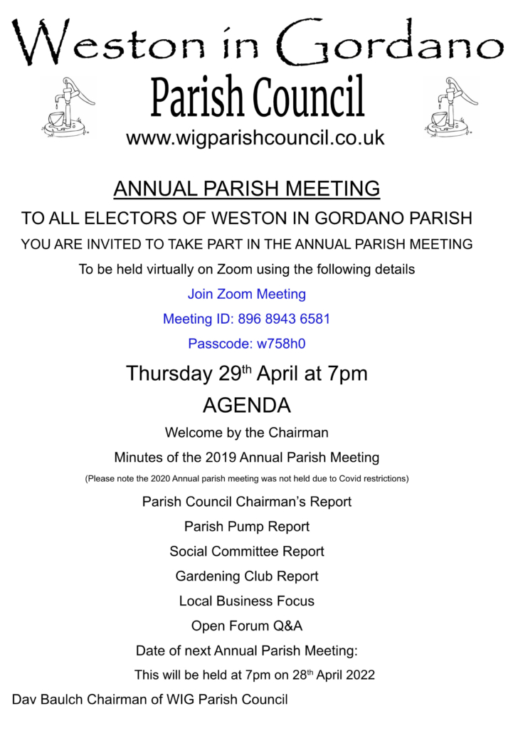 The annual parish council meeting will be held in the Village Hall at 7pm on 27th May 2021