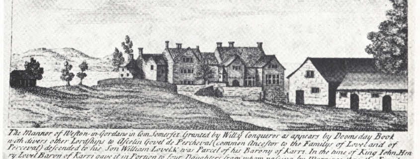 This manor house was built in about 1430 by the Perceval family, lords of the manor of Weston from the 1100s to the 1700s. This is the building shown in the engraving, the original of which is in the Somerset County Archive. It’s unusual in being built so low down in the valley, where you might think there was a risk of flooding, but the valley is very wide and even in the extremes of weather in recent years, this has never been a threat. It has been suggested that what is now the main drainage rhyne was navigable by flat bottomed boats, which might explain its position, but this is speculation.